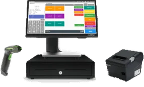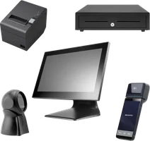 All-in-one checkout bundle with a touchscreen POS, customer display, payment terminal, receipt printer, barcode scanner, and cash drawer.